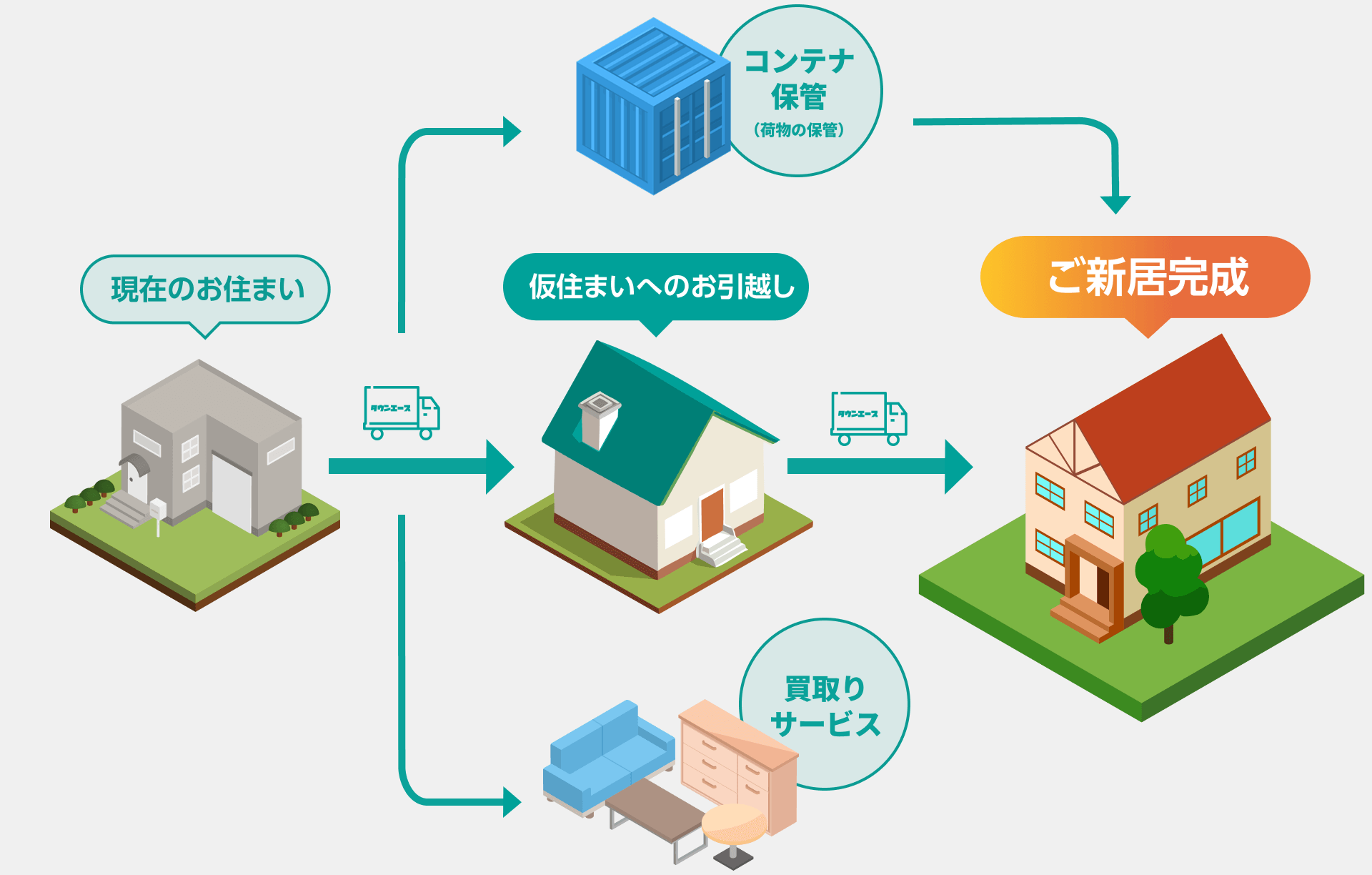 家の建替えの際、現在のお住まいから仮住まいへの引越しと、仮住まいから建替え後の新居への引越しと2回引越しを行います。 スムーズなお引越しと、それに伴う不用品の取り扱いについて、実績多数のタウンエースが責任を持って大切なお荷物をお預かりします。 仮住まい先が決まっていない場合の、お部屋探しのサポートも承っております。
